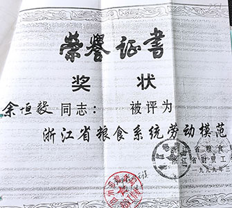 余恒毅于1995年被評為市糧食系統(tǒng)優(yōu)秀共產(chǎn)黨員,1996年榮獲溫州市優(yōu)秀共產(chǎn)黨員稱號,榮獲1997年溫州市勞動模范稱號,榮獲1999年浙江省糧食系統(tǒng)勞動模范。在榮譽(yù)的背后,是余恒毅在溫州市糧食系統(tǒng)四十九年的奮斗歷程,是在溫州面粉有限公司三十七年的默默耕耘。自他將一生的信念書寫于黨旗下,他就把一輩子最靚麗的青春都留在了麥堆上。